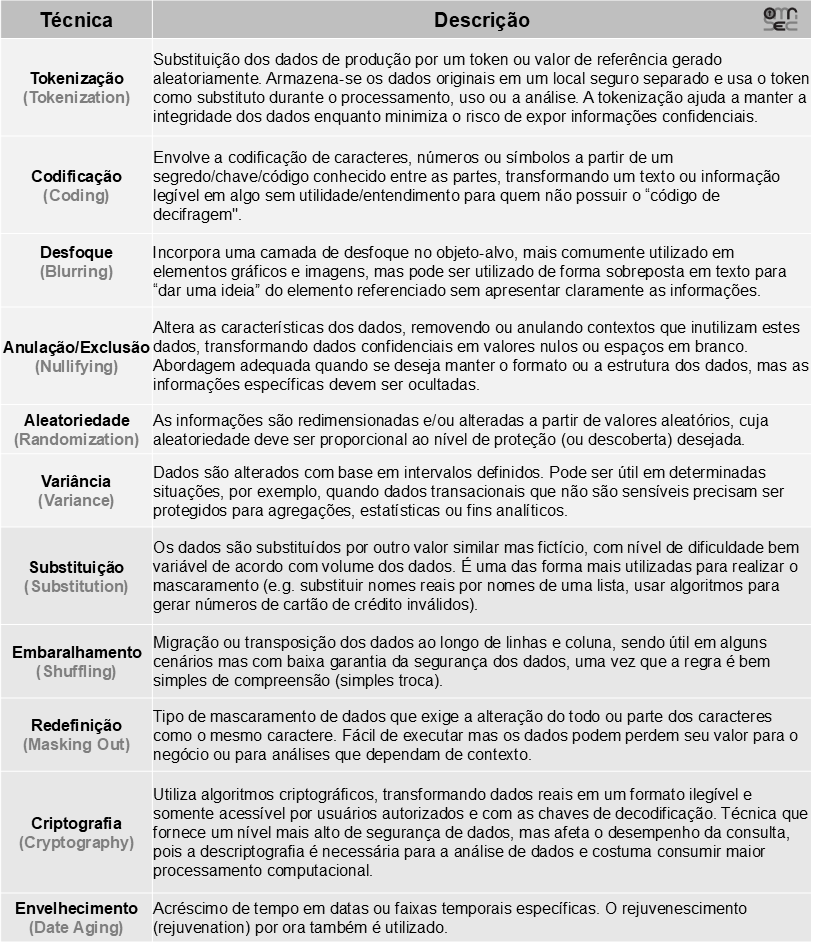 Importante mencionar que, ao contrário da criptografia (assunto para outro post), boa parte das técnicas de mascaramento podem implicar num processo irreversível de proteção de dados que garante a conformidade com regulamentos de proteção de dados, mantendo ainda as características originais do conjunto de dados não mascarado. Veja alguns métodos, requisitos e técnicas sobre.